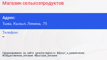 Магазин сельхозпродуктов по адресу Тыва, Кызыл, Ленина, 75 в дальнейшем Организация, размещена в следующих категориях: