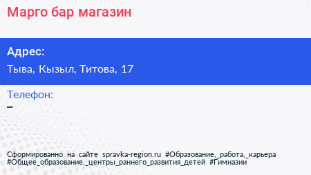 Марго, бар-магазин по адресу Тыва, Кызыл, Титова, 17 в дальнейшем Организация, размещена в следующих категориях: