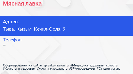 Мясная лавка по адресу Тыва, Кызыл, Кечил-Оола, 9 в дальнейшем Организация, размещена в следующих категориях: