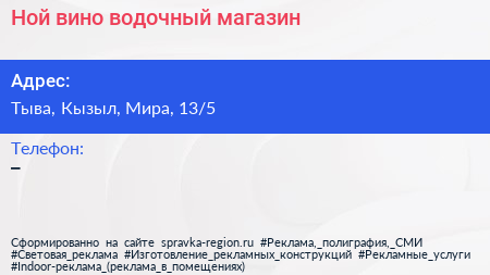 Ной, вино-водочный магазин по адресу Тыва, Кызыл, Мира, 13/5 в дальнейшем Организация, размещена в следующих категориях: