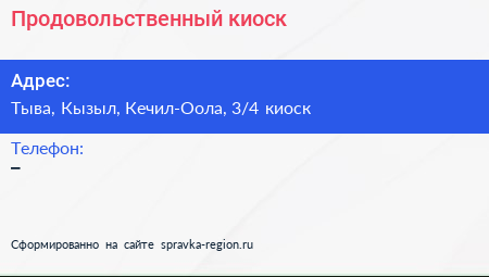 Продовольственный киоск по адресу Тыва, Кызыл, Кечил-Оола, 3/4 киоск в дальнейшем Организация, размещена в следующих категориях: