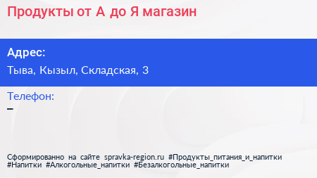 Продукты от А до Я, магазин по адресу Тыва, Кызыл, Складская, 3 в дальнейшем Организация, размещена в следующих категориях: