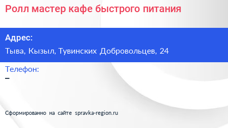 Ролл мастер, кафе быстрого питания по адресу Тыва, Кызыл, Тувинских Добровольцев, 24 в дальнейшем Организация, размещена в следующих категориях: