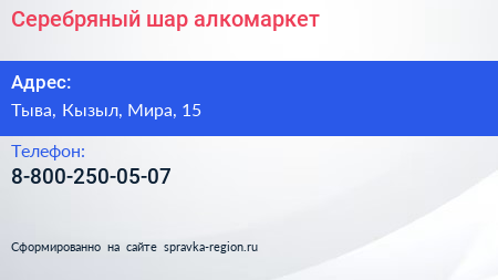 Серебряный шар, алкомаркет по адресу Тыва, Кызыл, Мира, 15 в дальнейшем Организация, размещена в следующих категориях: