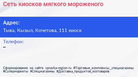 Сеть киосков мягкого мороженого по адресу Тыва, Кызыл, Кочетова, 111 киоск в дальнейшем Организация, размещена в следующих категориях: