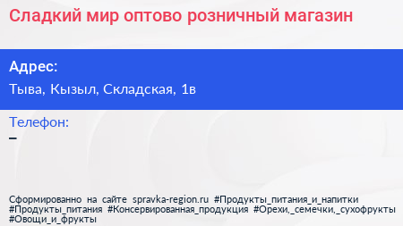 Сладкий мир, оптово-розничный магазин по адресу Тыва, Кызыл, Складская, 1в в дальнейшем Организация, размещена в следующих категориях: