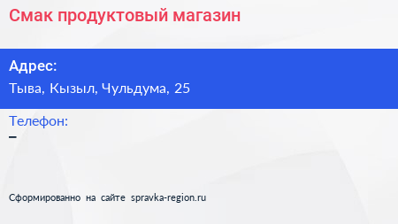 Смак, продуктовый магазин по адресу Тыва, Кызыл, Чульдума, 25 в дальнейшем Организация, размещена в следующих категориях: