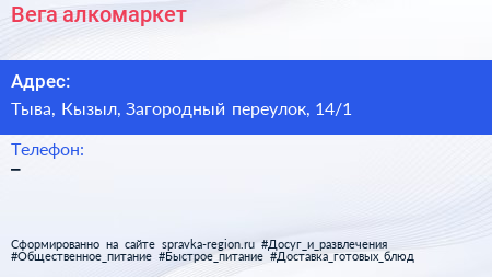 Вега, алкомаркет по адресу Тыва, Кызыл, Загородный переулок, 14/1 в дальнейшем Организация, размещена в следующих категориях: