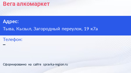 Вега, алкомаркет по адресу Тыва, Кызыл, Загородный переулок, 19 к7а в дальнейшем Организация, размещена в следующих категориях: