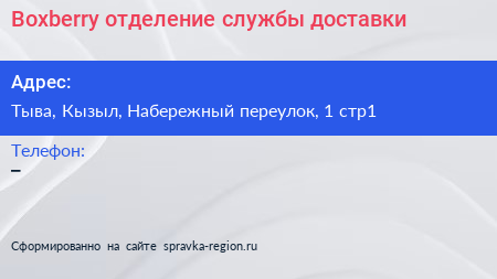 Boxberry, отделение службы доставки по адресу Тыва, Кызыл, Набережный переулок, 1 стр1 в дальнейшем Организация, размещена в следующих категориях: