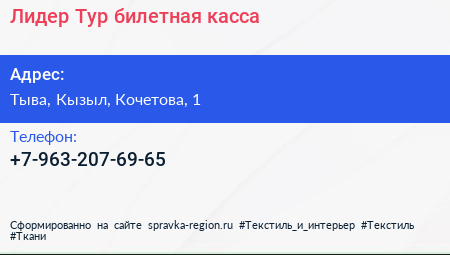 Лидер-Тур, билетная касса по адресу Тыва, Кызыл, Кочетова, 1 в дальнейшем Организация, размещена в следующих категориях: