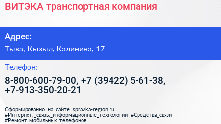 ВИТЭКА, транспортная компания по адресу Тыва, Кызыл, Калинина, 17 в дальнейшем Организация, размещена в следующих категориях: