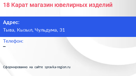 18 Карат, магазин ювелирных изделий по адресу Тыва, Кызыл, Чульдума, 31 в дальнейшем Организация, размещена в следующих категориях: