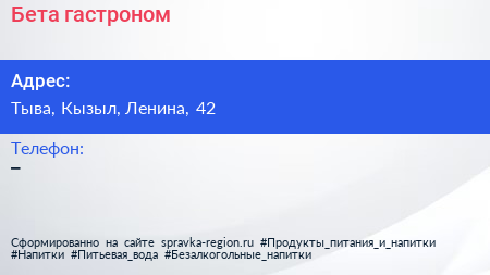 Бета, гастроном по адресу Тыва, Кызыл, Ленина, 42 в дальнейшем Организация, размещена в следующих категориях: