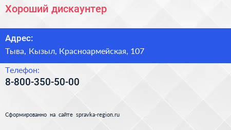 Хороший, дискаунтер по адресу Тыва, Кызыл, Красноармейская, 107 в дальнейшем Организация, размещена в следующих категориях: