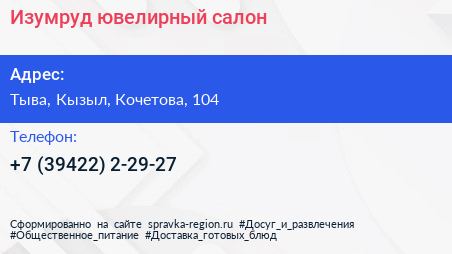 Изумруд, ювелирный салон по адресу Тыва, Кызыл, Кочетова, 104 в дальнейшем Организация, размещена в следующих категориях: