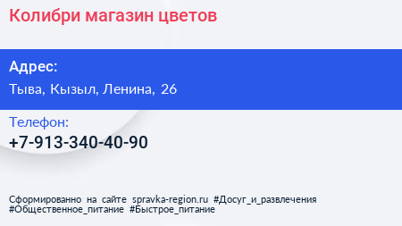Колибри, магазин цветов по адресу Тыва, Кызыл, Ленина, 26 в дальнейшем Организация, размещена в следующих категориях: