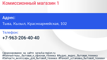 Комиссионный магазин №1 по адресу Тыва, Кызыл, Красноармейская, 102 в дальнейшем Организация, размещена в следующих категориях: