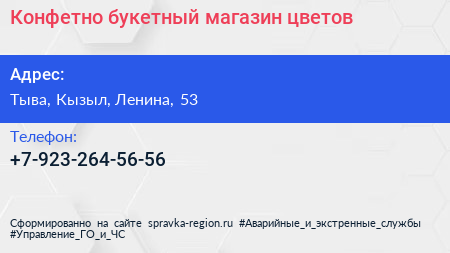 Конфетно-букетный, магазин цветов по адресу Тыва, Кызыл, Ленина, 53 в дальнейшем Организация, размещена в следующих категориях: