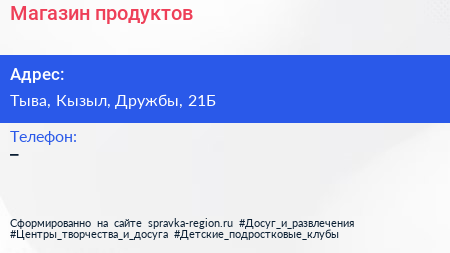Магазин продуктов по адресу Тыва, Кызыл, Дружбы, 21Б в дальнейшем Организация, размещена в следующих категориях: