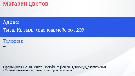 Магазин цветов по адресу Тыва, Кызыл, Красноармейская, 209 в дальнейшем Организация, размещена в следующих категориях: