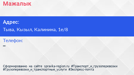 Мажалык по адресу Тыва, Кызыл, Калинина, 1е/8 в дальнейшем Организация, размещена в следующих категориях: