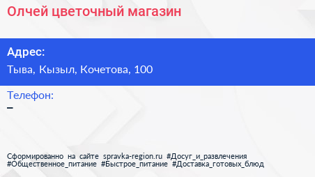 Олчей, цветочный магазин по адресу Тыва, Кызыл, Кочетова, 100 в дальнейшем Организация, размещена в следующих категориях: