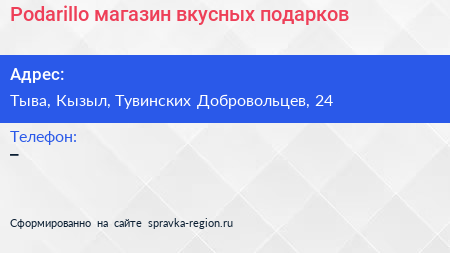 Podarillo, магазин вкусных подарков по адресу Тыва, Кызыл, Тувинских Добровольцев, 24 в дальнейшем Организация, размещена в следующих категориях: