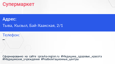 Супермаркет по адресу Тыва, Кызыл, Бай-Хаакская, 2/1 в дальнейшем Организация, размещена в следующих категориях: