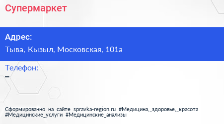 Супермаркет по адресу Тыва, Кызыл, Московская, 101а в дальнейшем Организация, размещена в следующих категориях: