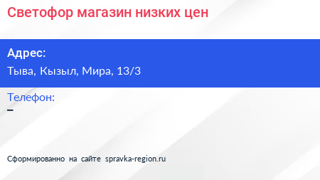Светофор, магазин низких цен по адресу Тыва, Кызыл, Мира, 13/3 в дальнейшем Организация, размещена в следующих категориях: