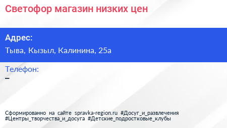 Светофор, магазин низких цен по адресу Тыва, Кызыл, Калинина, 25а в дальнейшем Организация, размещена в следующих категориях:
