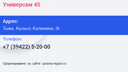 Универсам 45 по адресу Тыва, Кызыл, Калинина, 3г в дальнейшем Организация, размещена в следующих категориях: