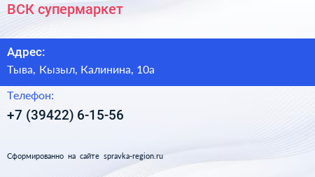 ВСК, супермаркет по адресу Тыва, Кызыл, Калинина, 10а в дальнейшем Организация, размещена в следующих категориях: