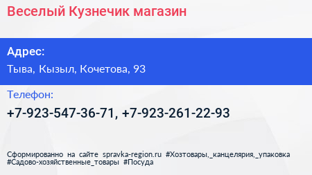 Веселый Кузнечик, магазин по адресу Тыва, Кызыл, Кочетова, 93 в дальнейшем Организация, размещена в следующих категориях: