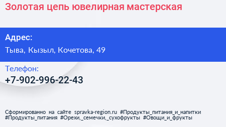 Золотая цепь, ювелирная мастерская по адресу Тыва, Кызыл, Кочетова, 49 в дальнейшем Организация, размещена в следующих категориях: