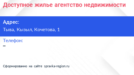 Доступное жилье, агентство недвижимости по адресу Тыва, Кызыл, Кочетова, 1 в дальнейшем Организация, размещена в следующих категориях: