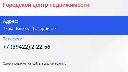 Городской центр недвижимости по адресу Тыва, Кызыл, Гагарина, 7 в дальнейшем Организация, размещена в следующих категориях:
