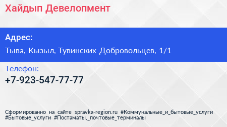 Хайдып Девелопмент по адресу Тыва, Кызыл, Тувинских Добровольцев, 1/1 в дальнейшем Организация, размещена в следующих категориях: