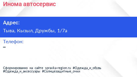 Инома, автосервис по адресу Тыва, Кызыл, Дружбы, 1/7а в дальнейшем Организация, размещена в следующих категориях: