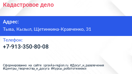 Кадастровое дело по адресу Тыва, Кызыл, Щетинкина-Кравченко, 31 в дальнейшем Организация, размещена в следующих категориях: