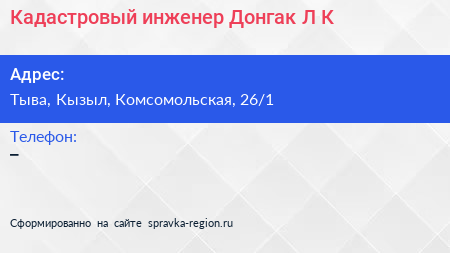 Кадастровый инженер Донгак Л.К по адресу Тыва, Кызыл, Комсомольская, 26/1 в дальнейшем Организация, размещена в следующих категориях: