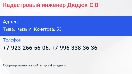 Кадастровый инженер Дюдюк С.В. по адресу Тыва, Кызыл, Кочетова, 53 в дальнейшем Организация, размещена в следующих категориях:
