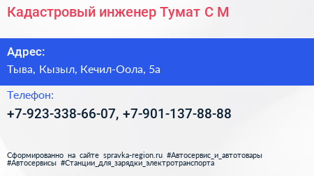Кадастровый инженер Тумат С.М. по адресу Тыва, Кызыл, Кечил-Оола, 5а в дальнейшем Организация, размещена в следующих категориях: