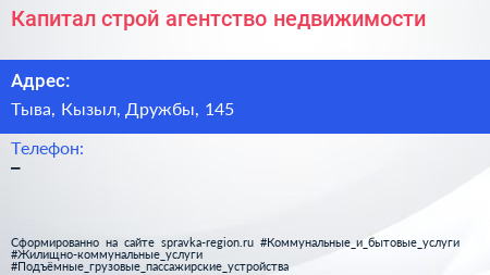Капитал-строй, агентство недвижимости по адресу Тыва, Кызыл, Дружбы, 145 в дальнейшем Организация, размещена в следующих категориях: