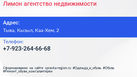 Лимон, агентство недвижимости по адресу Тыва, Кызыл, Каа-Хем, 2 в дальнейшем Организация, размещена в следующих категориях: