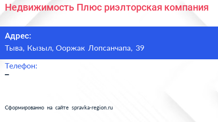 Недвижимость Плюс, риэлторская компания по адресу Тыва, Кызыл, Ооржак Лопсанчапа, 39 в дальнейшем Организация, размещена в следующих категориях: