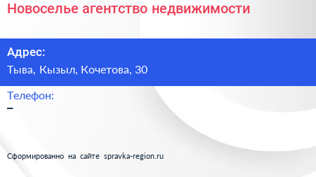 Новоселье, агентство недвижимости по адресу Тыва, Кызыл, Кочетова, 30 в дальнейшем Организация, размещена в следующих категориях: