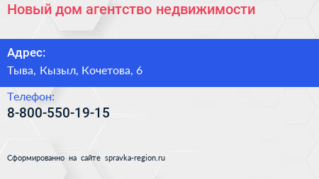 Новый дом, агентство недвижимости по адресу Тыва, Кызыл, Кочетова, 6 в дальнейшем Организация, размещена в следующих категориях: