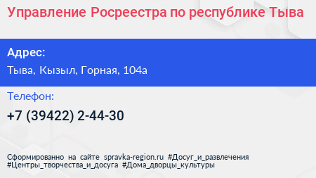 Управление Росреестра по республике Тыва по адресу Тыва, Кызыл, Горная, 104а в дальнейшем Организация, размещена в следующих категориях: